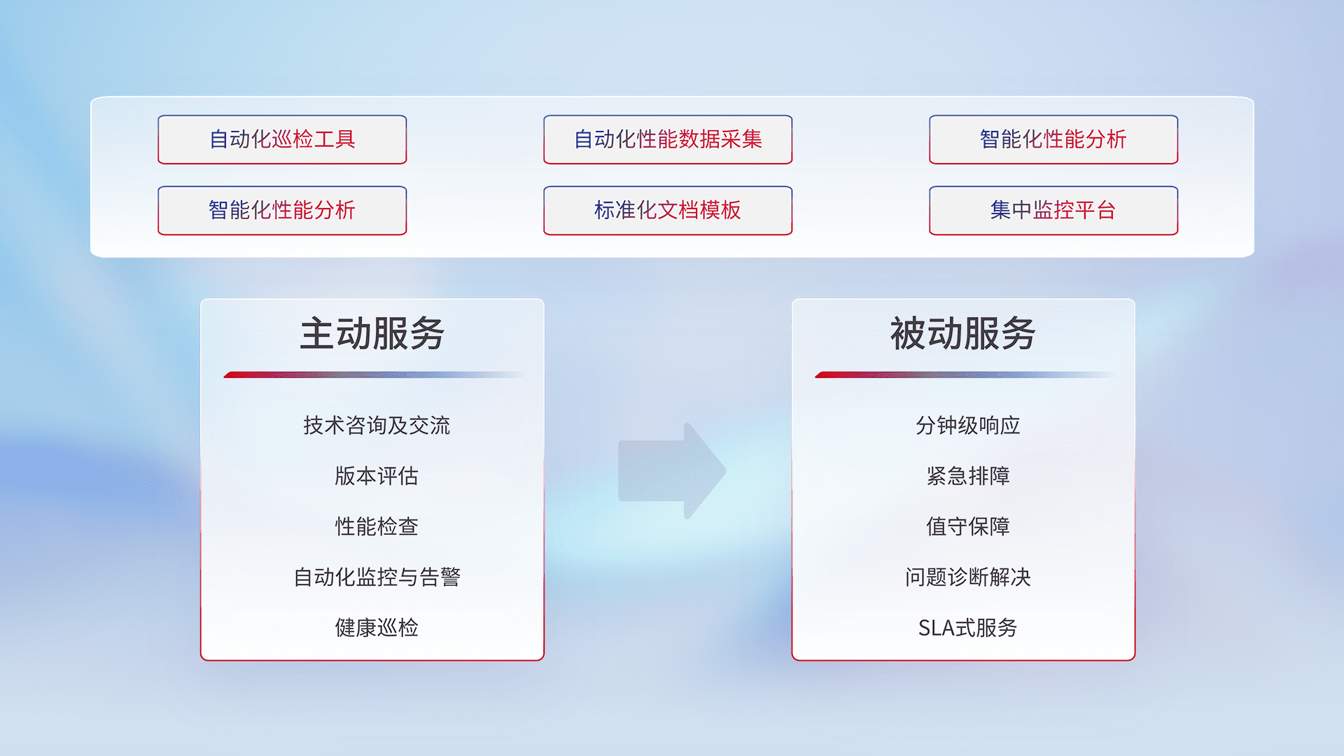 智能化工具和标准化文档,,,保障服务质量,,提供主动服务(包含技术咨询、、版本评估、、、性能检查、、、自动化监控与告警、、、健康巡检)和被动服务包含(分钟级响应、、紧急排障、、、值守保障、、、问题诊断解决、、、、SLA服务)。。。